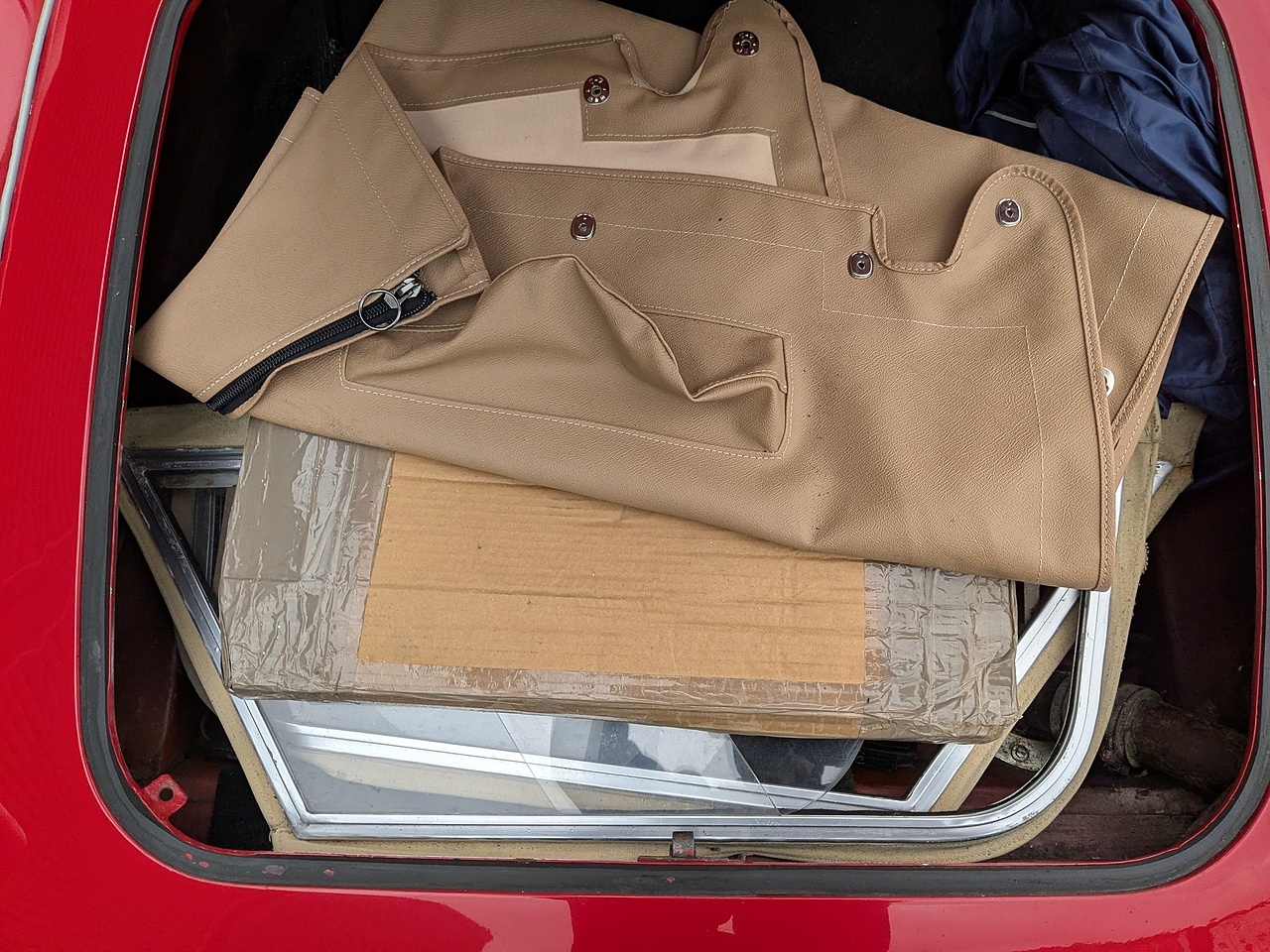The seats have been been refurbished and it has a new tonneau cover in matching oatmeal, a new black vinyl hood (still in the box) and the hood frame is also included. There are a pair of side screens and a car cover in the boot. Unusually the car comes with a new fibreglass hardtop, which fits well, and would make the car suitable for year round use.