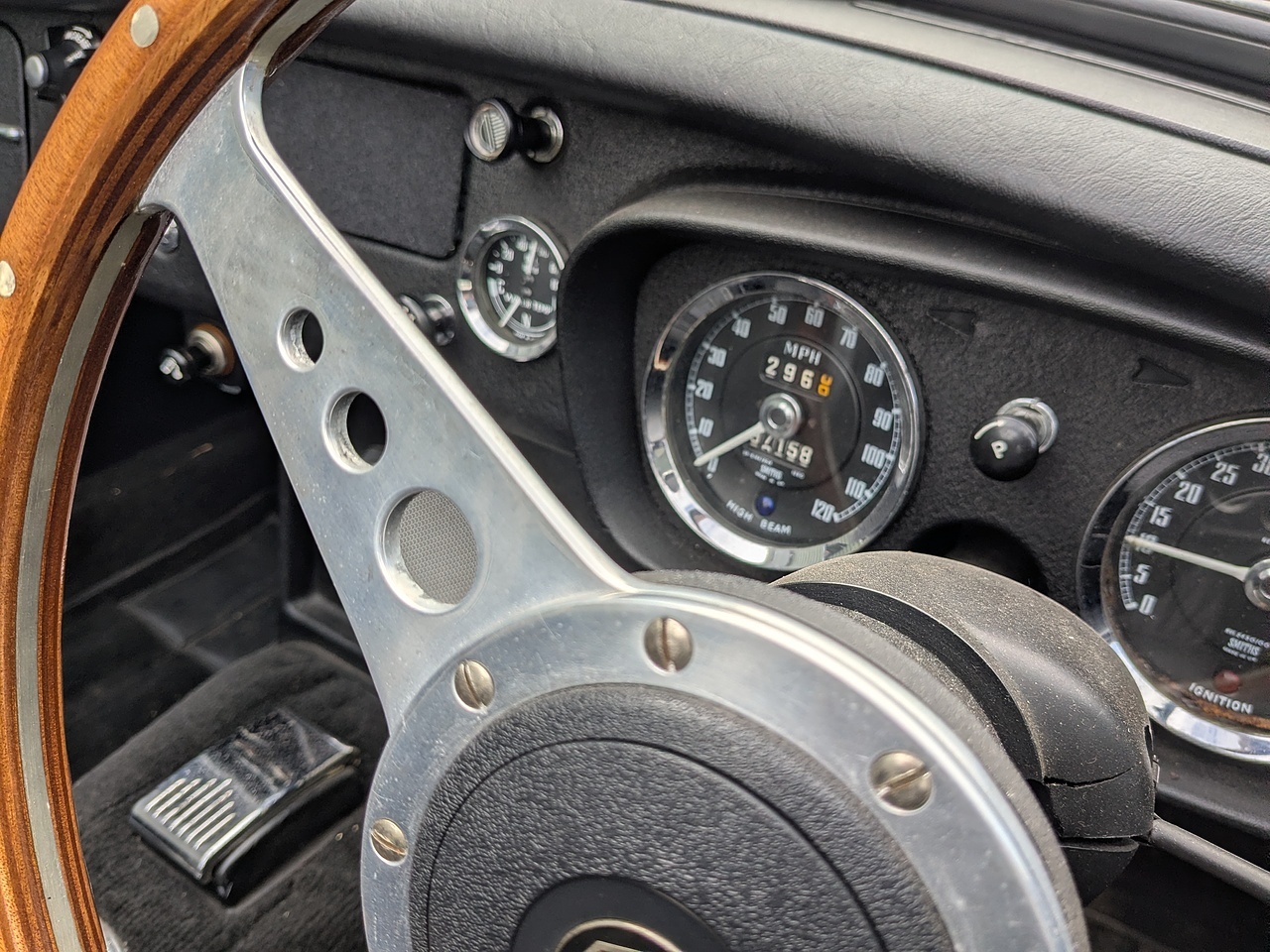 The interior is very pleasant, the seats in excellent condition and what appear to be fairly recent carpets with a nice period Moto-Lita steering wheel to complete the picture.